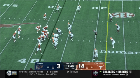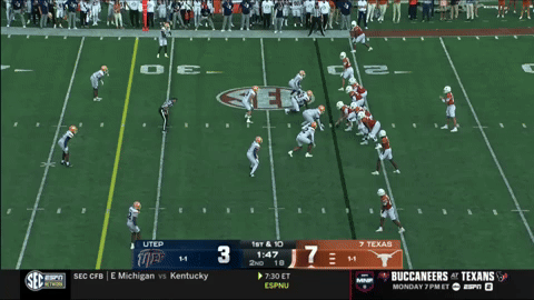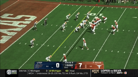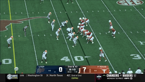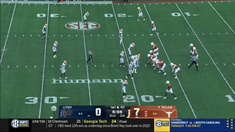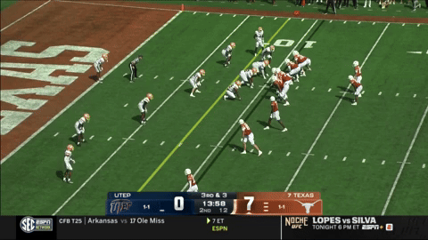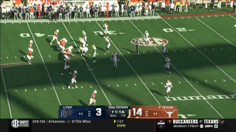 One thing that shows up on tape a LOT is that Texas’s receivers and tight ends aren’t willing blockers in the run game. This is just one example with Ryan Wingo, but his inability or unwillingness to block in the run game shows up on tape. He’s at the bottom of the screen here. Arch actually makes the right read on an option keeper and gets positive yards, but Wingo won’t engage a defender and it allows UTEP to stop this from becoming an explosive play.